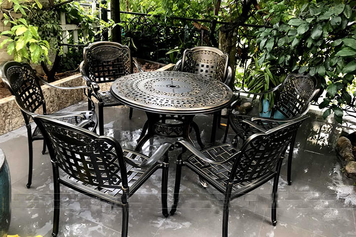 Chất liệu này không chỉ cứng cáp mà còn có khả năng kháng nước, kháng gỉ và hạn chế tối đa các tác động từ môi trường. Bạn có thể đặt bộ bàn ghế nhôm đúc nghệ thuật làm bàn ăn/bàn trà tại khu vực sân vườn/ban công mà không phải lo sợ thời tiết bào mòn.
