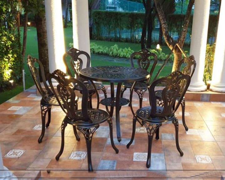 Bộ bàn ghế sân vườn được làm bằng chất liệu nhôm đúc và được phủ thêm hai lớp sơn tĩnh điện cao cấp. Chất liệu này không chỉ cứng cáp mà còn có khả năng kháng nước, kháng gỉ và hạn chế tối đa các tác động từ môi trường. Bạn có thể đặt bộ bàn ghế nhôm đúc nghệ thuật làm bàn ăn/bàn trà tại khu vực sân vườn/ban công mà không phải lo sợ thời tiết bào mòn.