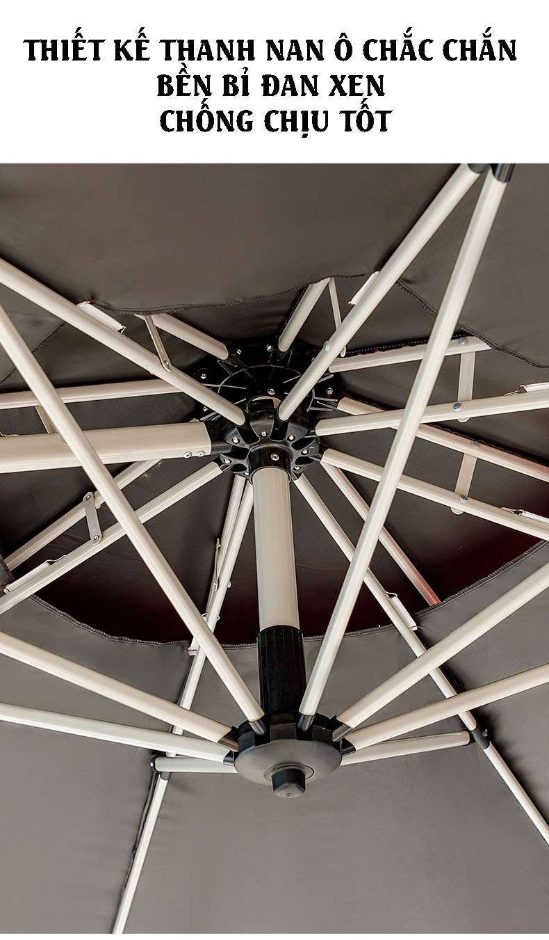 Khung của ô lệch hợp kim nhôm xoay 360 độ được sử đúc bằng hợp kim nhôm định hình chịu được tác ngoại lực lớn mà không bị biến dạng, nan ô được sử dụng bằng hộp mạ kẽm sơn tĩnh điện