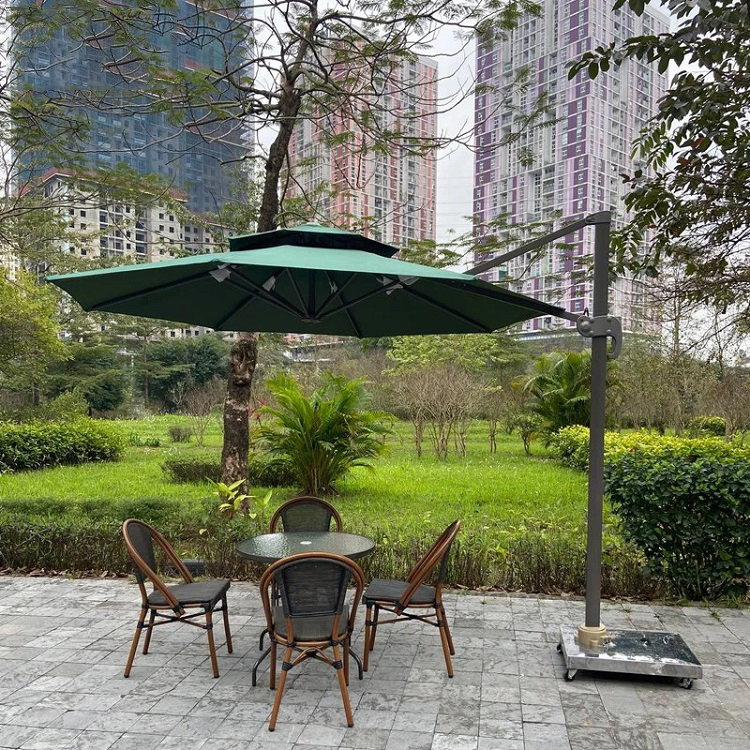 Ô lệch tâm tròn dùng để trang trí sân vườn bạn có thể xoay và điều chỉnh mọi hướng, nấc xoay 360 độ giúp bạn dễ dàng điều chính theo hướng nắng một cách thoải mãi và mang đến khả năng che nắng hoàn hỏa nhất, bạn có thể điều chỉnh ô nghiêng theo ý muốn mà không cân mất thời gian để dịch chuyển cả chân đế của ô.